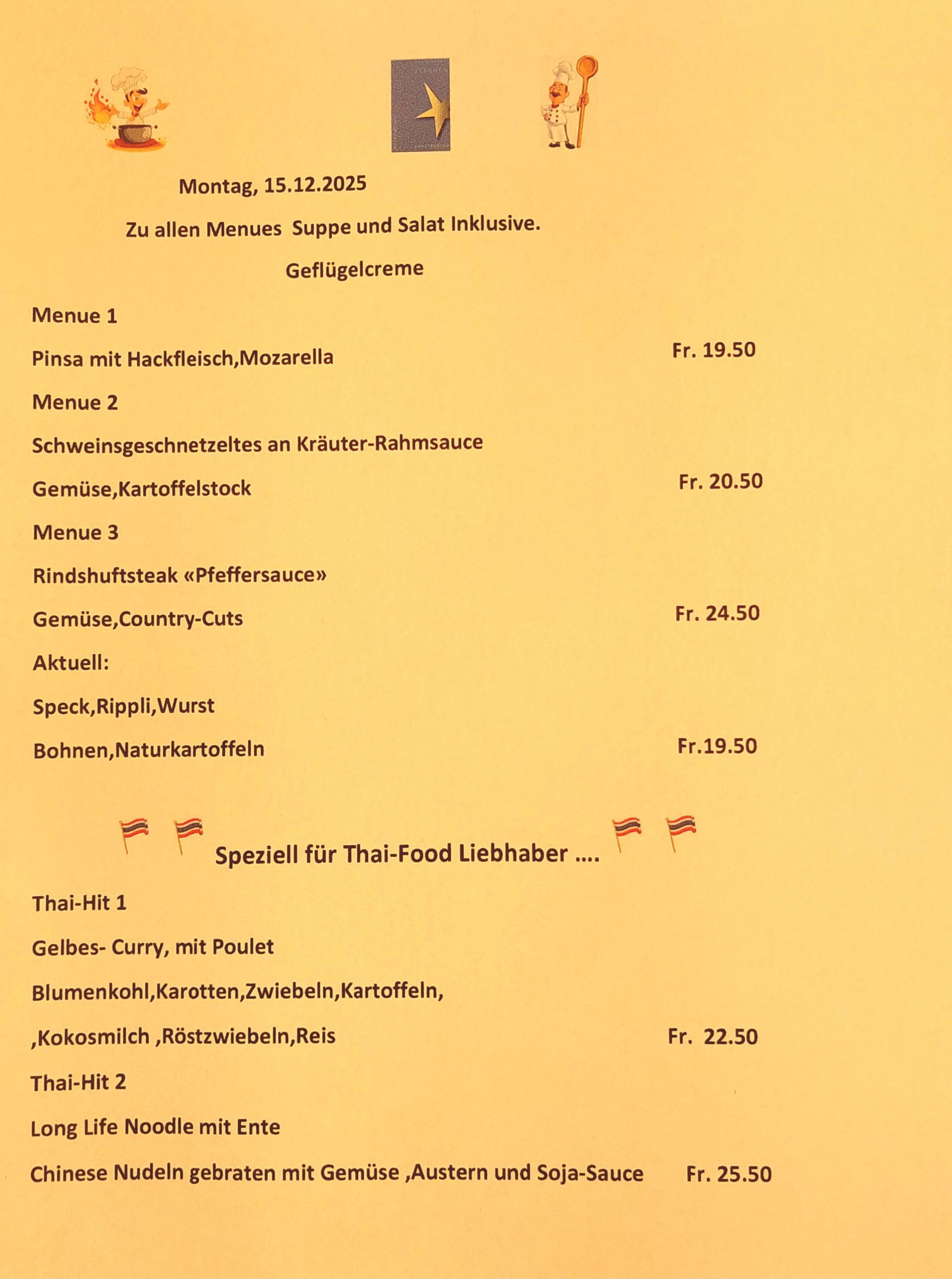 Wir bieten ein breites Spektrum an köstlichen Gerichten, die aus frischen Zutaten zubereitet werden. Unser erfahrenes Team aus Köchen und Servicemitarbeitern steht Ihnen jederzeit zur Verfügung, um sicherzustellen, dass Sie ein angenehmes und unvergessliches Erlebnis haben. Wir legen grossen Wert auf Qualität und Kundenzufriedenheit, daher servieren wir nur die besten Speisen aus der gut bürgerlichen Küche.
