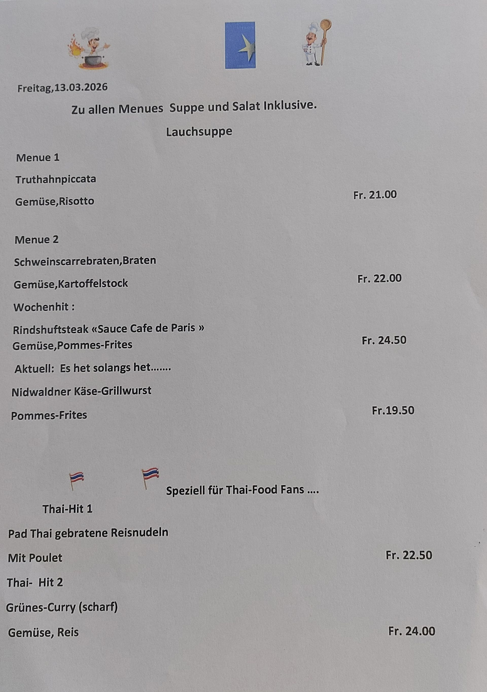 Wir bieten ein breites Spektrum an köstlichen Gerichten, die aus frischen Zutaten zubereitet werden. Unser erfahrenes Team aus Köchen und Servicemitarbeitern steht Ihnen jederzeit zur Verfügung, um sicherzustellen, dass Sie ein angenehmes und unvergessliches Erlebnis haben. Wir legen grossen Wert auf Qualität und Kundenzufriedenheit, daher servieren wir nur die besten Speisen aus der gut bürgerlichen Küche.